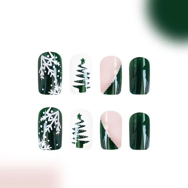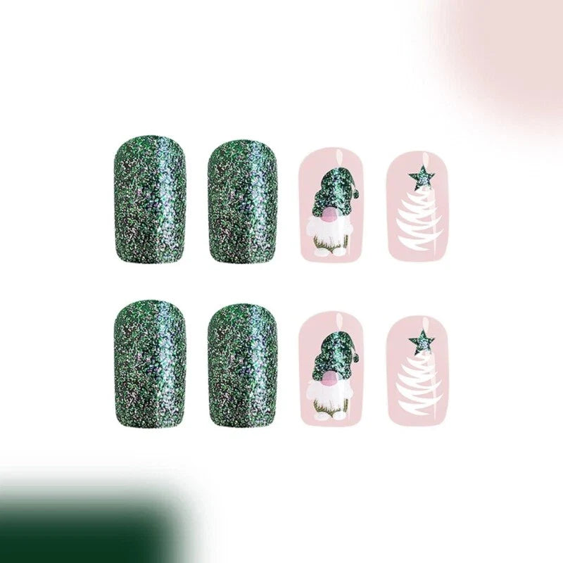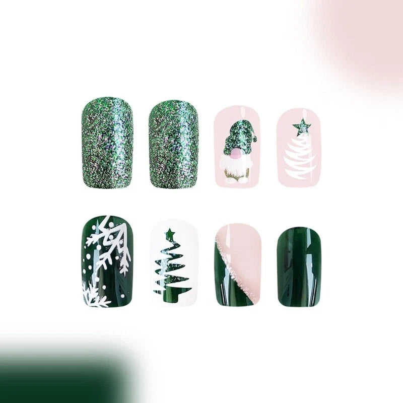 Featuring a vibrant green base, Santa and Christmas tree designs, and sparkling glitter accents, these short glossy square nails give you a salon-perfect look from home. Made from high-quality, durable ABS material, theyβre lightweight, comfortable, and easy to apply with nail glue or adhesive tabs.